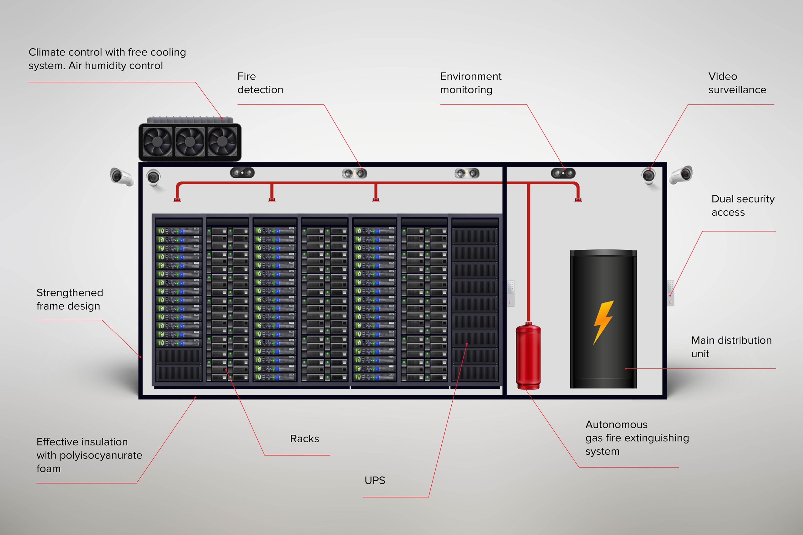 Accommodates up to 6 racks for computing equipment with a total capacity of up to 288 U, with a payload of 15 kW per rack